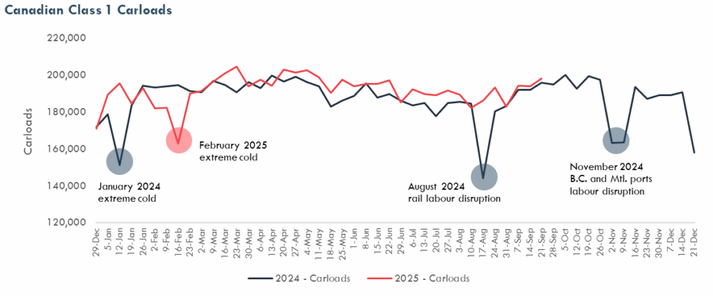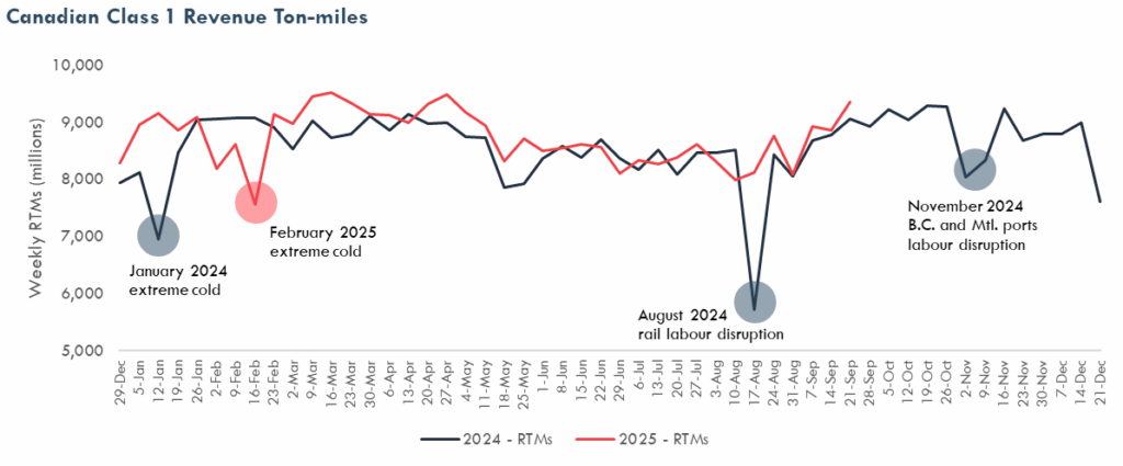 In week 39 (September 21-27), Canadian Class 1 (CN and CPKC) network-wide freight traffic increased by 1% (carloads) and 3% (revenue ton-miles, RTMs) compared to the same week in 2024. Across their North American networks, both carloads and RTMs increased for grain & fertilizers and intermodal while decreasing for forest products and automotive. Results for other commodities were mixed. Carloads of coal increased while RTMs decreased. The opposite trend was observed for metals and minerals and for energy, chemicals and plastics, where RTMs increased but carloads decreased.