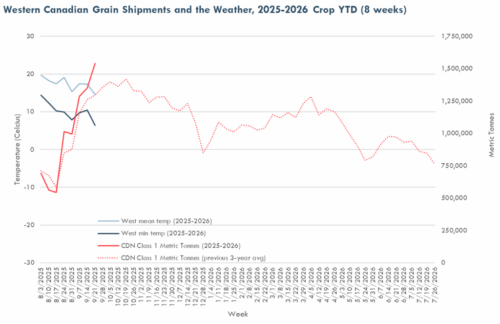 In Week 8 (September 21-27) of the 2025-2026 crop year, CN and CPKC moved more than 1.5 million metric tonnes of Canadian grain and grain products.